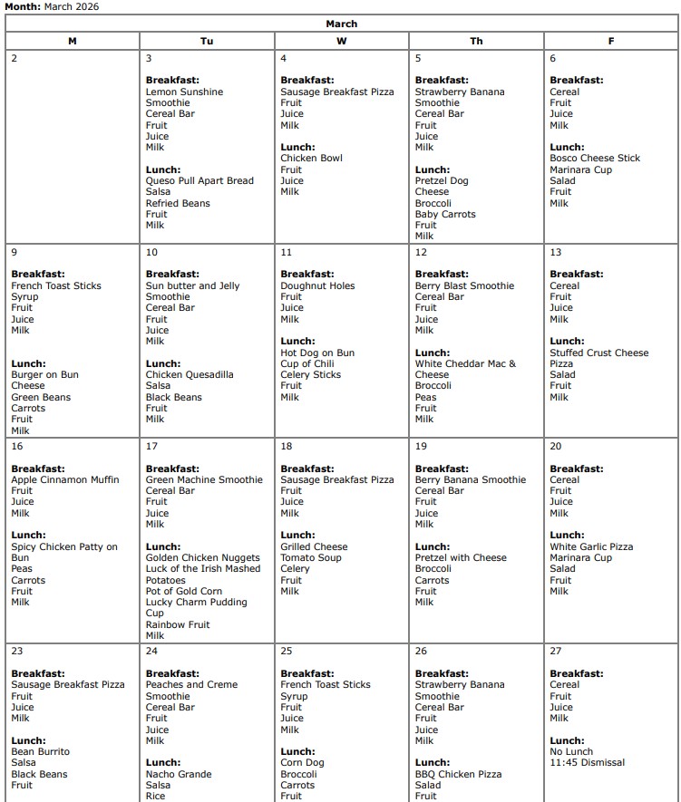 • Parent Resources - March 2026: Breakfast & Lunch Menu