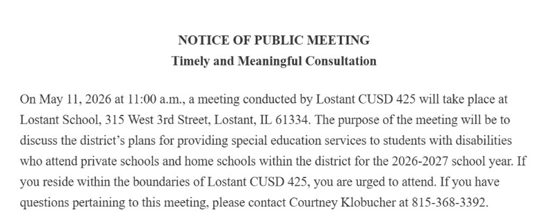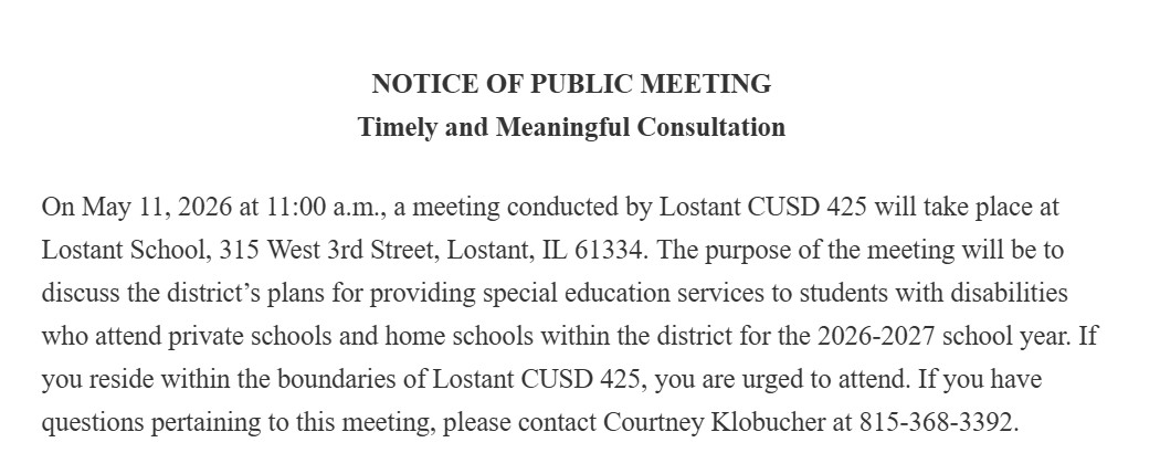 Lostant CUSD 425315 W 3rd StreetLostant, IL  61334PH: 815.368.3392